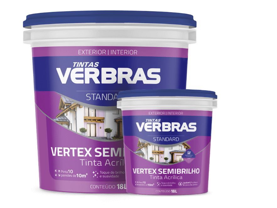 VERTEX SEMIBRILHO STANDARD VERBRAS é uma tinta à base de resina acrílica. Fórmula inovadora que facilita a aplicação e proporciona ao acabamento um toque de brilho, suavidade e requinte. * Sem cheiro entre duas a três horas após aplicação. Possui ótima qualidade e é indicado para pinturas externas e internas em superfícies de reboco, texturas, concretos, massa acrílica ou corrida, fibrocimento e gesso. Diluir 20% com Água Potável para todas as superfícies. PISTOLA: Diluir 30% com água potável, pressão entre 2,2 e 2,8kgf/cm² ou 30 a 35 lbs/pol². Aplicação: Rolo de lã(pelo baixo), pincel ou trincha. DEMÃO: Duas a três, com intervalo de quatro horas. 1 Demão: recomendamos somente para repintura e quando se mantem a cor original. 2 Demãos: normalmente quase todas as superfícies são necessárias pelo menos duas demãos para obter um bom resultado. 3 Demãos: recomendamos quando a cor escolhida for escura ou quando se pretende pintar com uma cor clara sobre um fundo escuro. Secagem: Ao toque: 1 hora. Entre demãos: 4 horas. Final: 8 horas. Composição: Água, emulsão estireno-acrílico, pigmentos orgânicos e/ou inorgânicos, cargas minerais inertes e aditivos. Desenvolvido conforme Norma: NBR 15079 e NBR 11702 Tipo 4.5.2 Látex Standard da ABNT (Associação Brasileira de Normas Técnicas). CORES: Conforme catálago Verbras. Evite pintar em dias chuvosos, com ventos fortes, temperaturas abaixo de 10ºC e/ou umidade superior a 90%. Até mais ou menos duas semanas de pintado, pingos de chuva podem provocar manchas. Se ocorrer lavar toda a superfície com água potável. OBSERVAÇÃO: A luminosidade do ambiente, onde será aplicado a tinta, também pode interferir na tonalidade da cor escolhida.